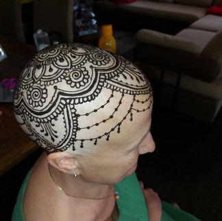 Il decoro all’henné che ricoprirà il tuo capo è una forma temporanea sicura di body art, viene creata a mano libera dopo che avremo concordato un disegno insieme.